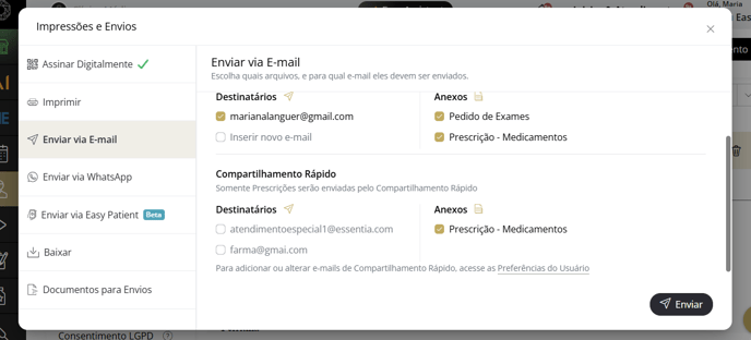 - Ao finalizar o atendimento, aparecerá a tela de impressões e envios. Nessa tela, você conseguirá visualizar a impressão dos documentos, escolher por onde gostaria de enviar e realizar a assinatura digital.
