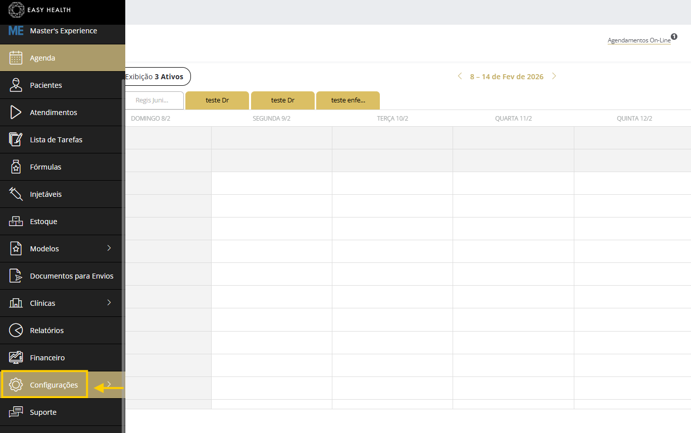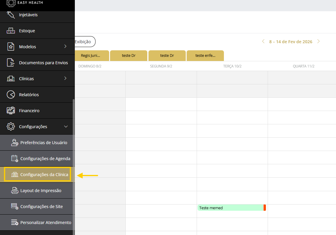 - Em seguida iremos clicar em configurações da clínica, onde será acessado o menu que irá alterar as informações.