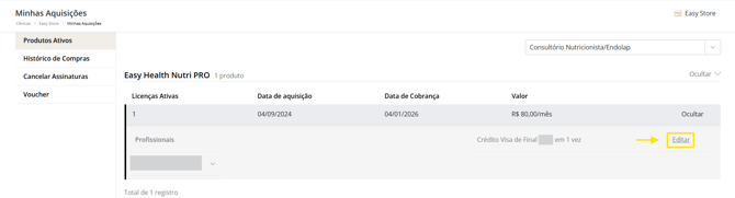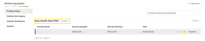 - Após clicar em Produtos Ativos, iremos clicar em no Plano que adquirimos. Ex: Easy Health Nutri PRO. Em seguida, iremos clicar em Detalhes.