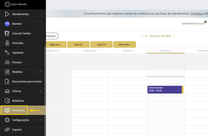 - Para acessar a aba de Recibos, iremos navegar pelo Menu Lateral, e clicar em Financeiro.