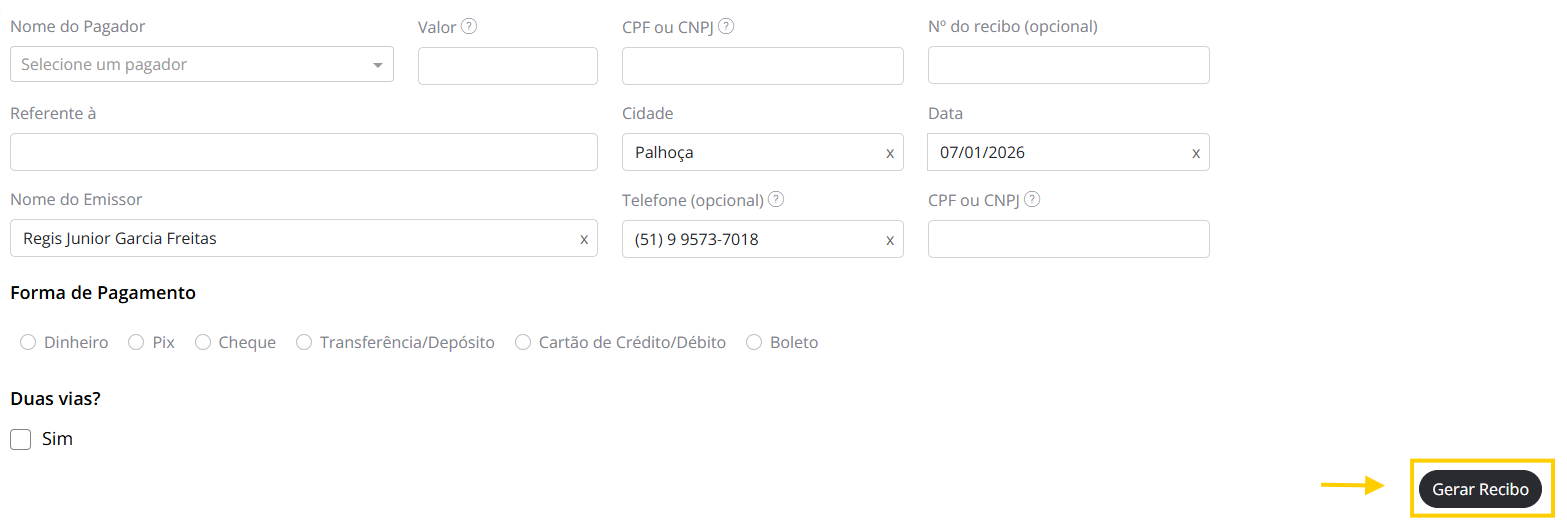 - Na Aba Gerar Recibos, vamos visualizar todos os campos necessários para preencher o Recibo. E após isso iremos clicar em Gerar Recibo.