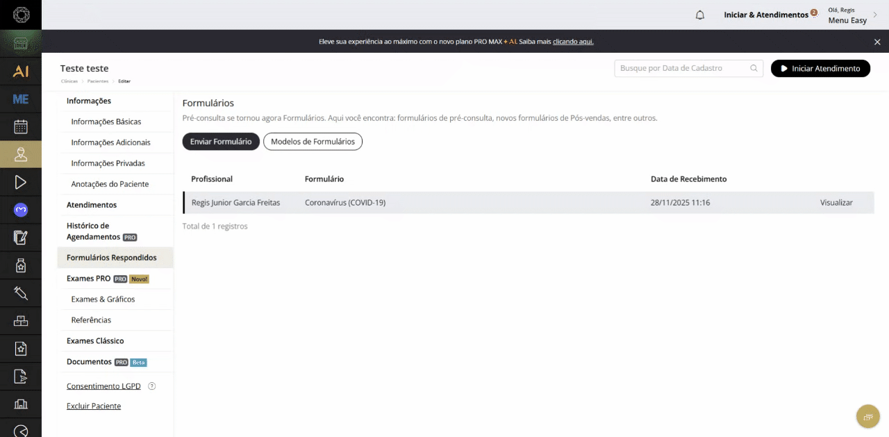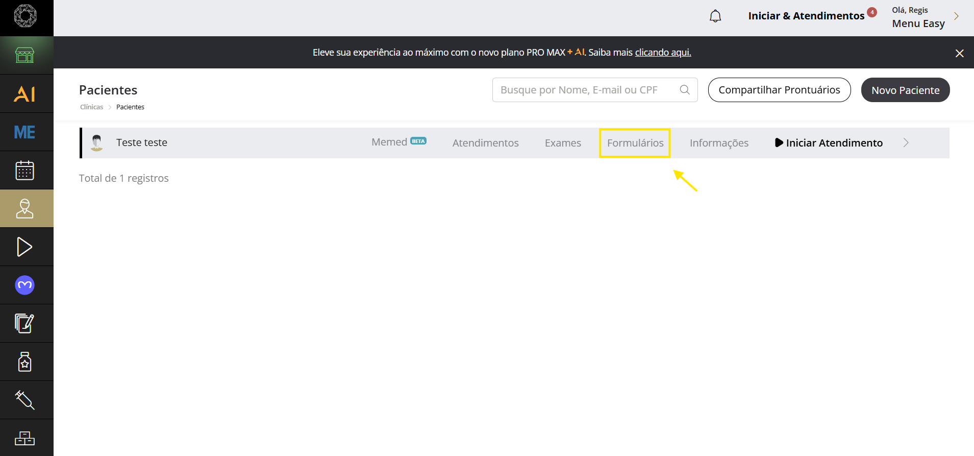 - Na página Pacientes, após localizar o paciente em questão, iremos clicar em Formulários.