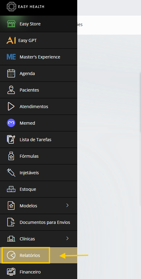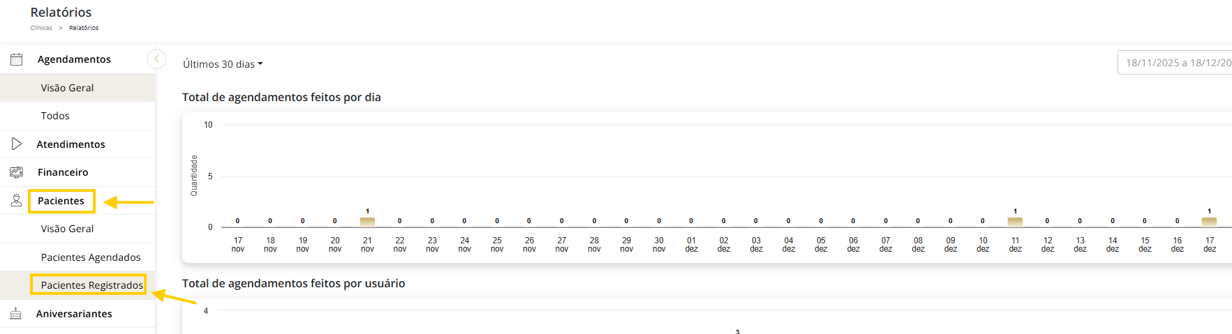 - Para acessar o relatório de pacientes, iremos navegar pelo Menu lateral e clicar na aba Relatórios.